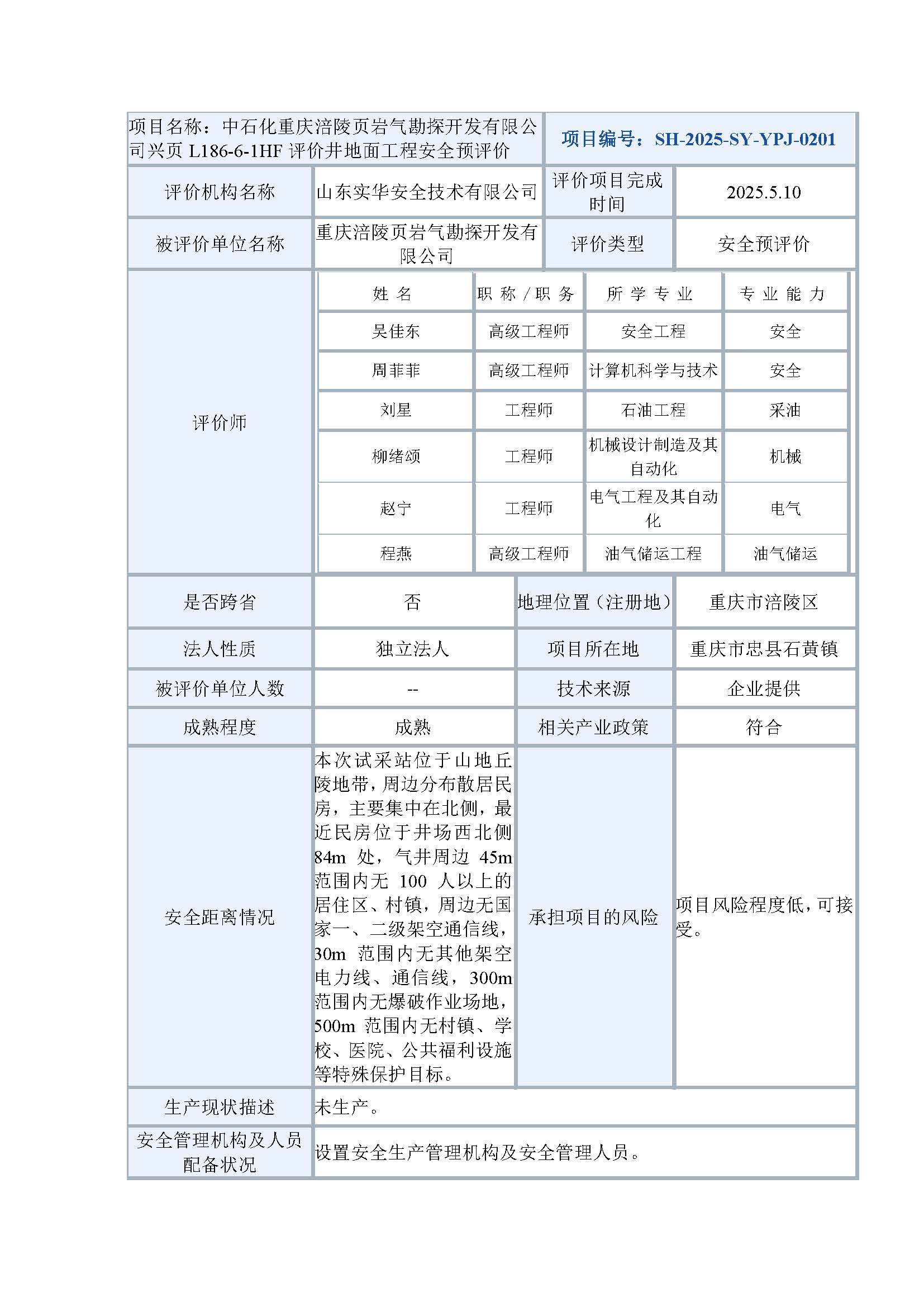 中石化重慶涪陵頁(yè)巖氣勘探開發(fā)有限公司興頁(yè)L186-6-1HF評(píng)價(jià)井地面工程安全預(yù)評(píng)價(jià)