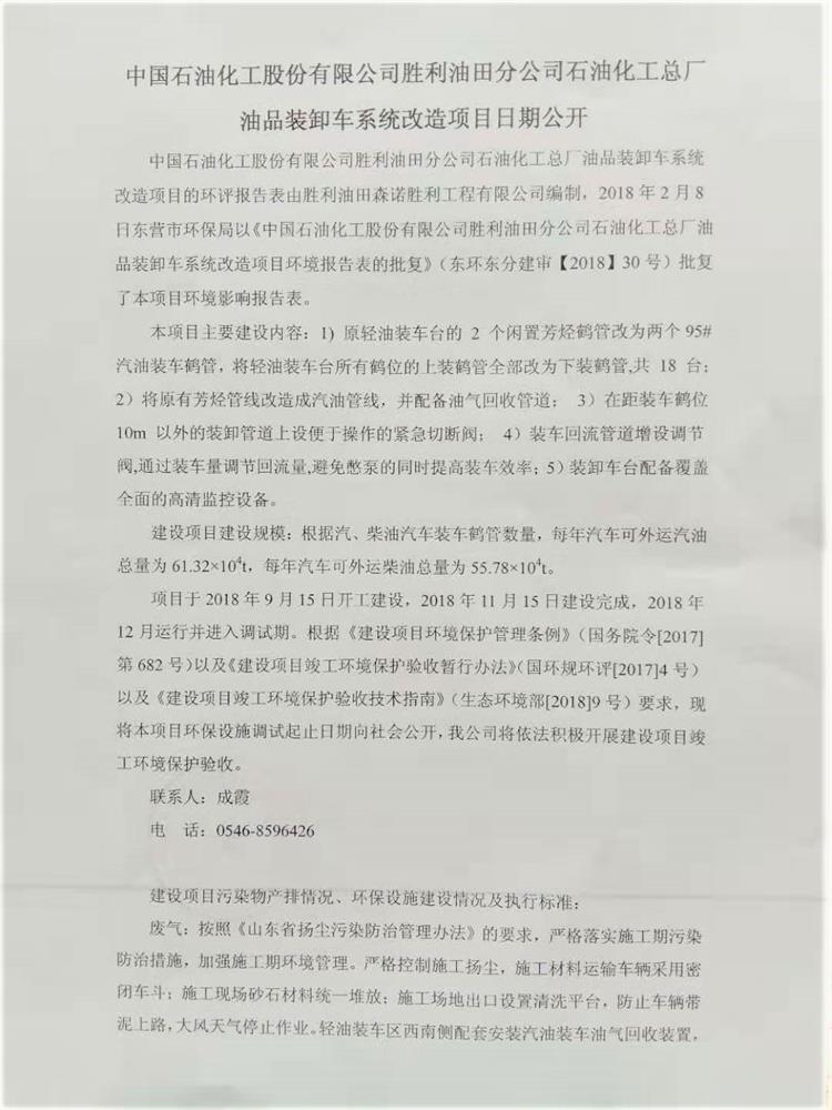 中國石油化工股份有限公司勝利油田分公司石油化工總廠油品裝卸車系統(tǒng)改造項目日期公開