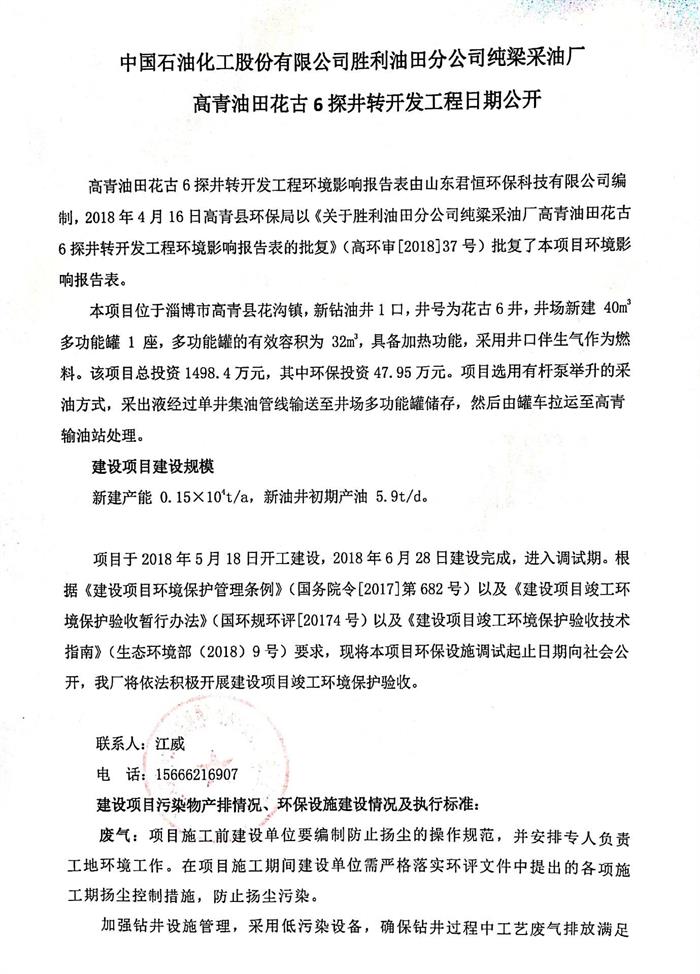 中國(guó)石油化工股份有限公司勝利油田分公司純梁采油廠高青油田花古6探井轉(zhuǎn)開(kāi)發(fā)工程日期公開(kāi)