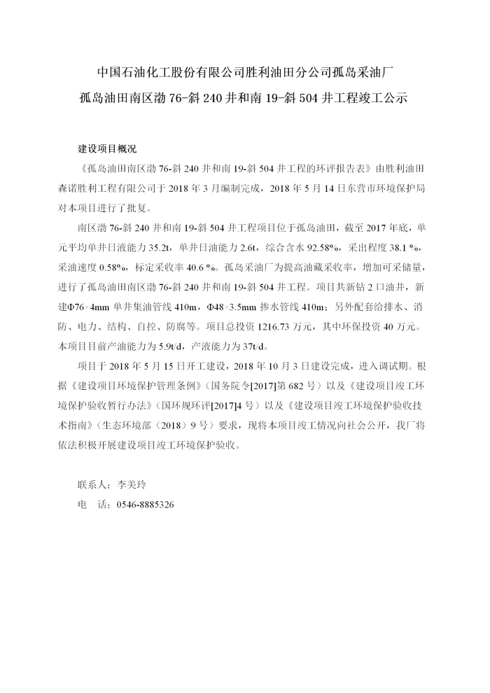 中國石油化工股份有限公司勝利油田分公司孤島采油廠孤島油田南區(qū)渤76-斜240井和南19-斜504井工程竣工公示