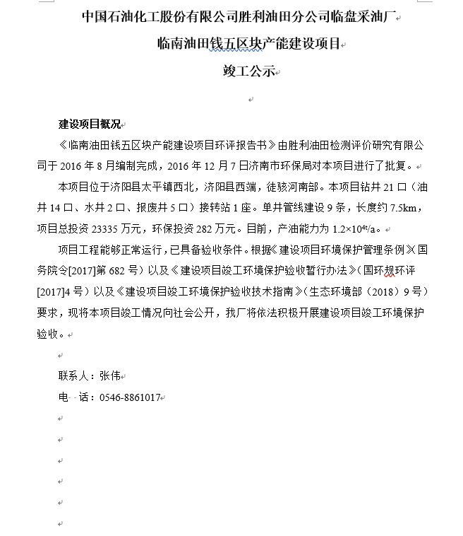 中國(guó)石油化工股份有限公司勝利油田分公司臨盤(pán)采油廠(chǎng)臨南油田錢(qián)五區(qū)塊產(chǎn)能建設(shè)項(xiàng)目竣工公示