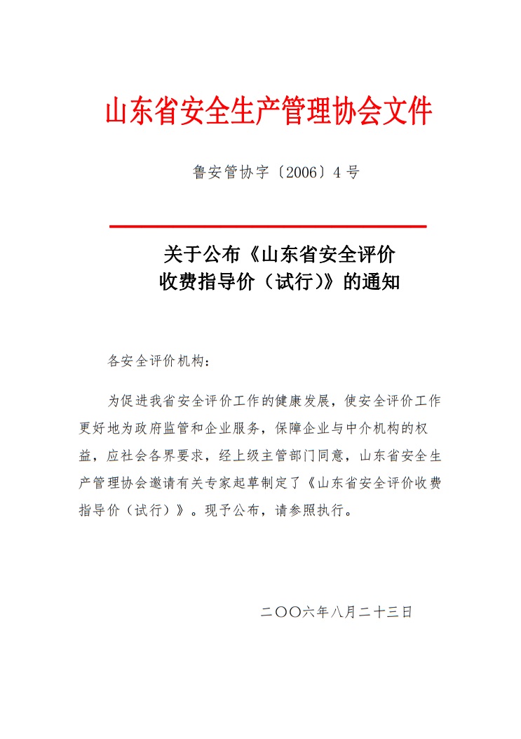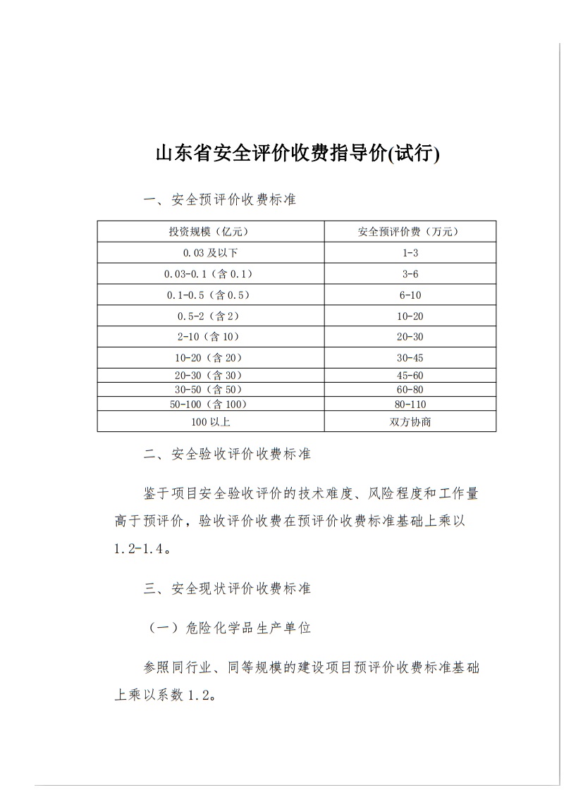 根據(jù)《山東省安全評(píng)價(jià)收費(fèi)指導(dǎo)價(jià)(試行)》魯安管協(xié)字〔2006〕4號(hào)的要求,我單位收費(fèi)標(biāo)準(zhǔn)如下: