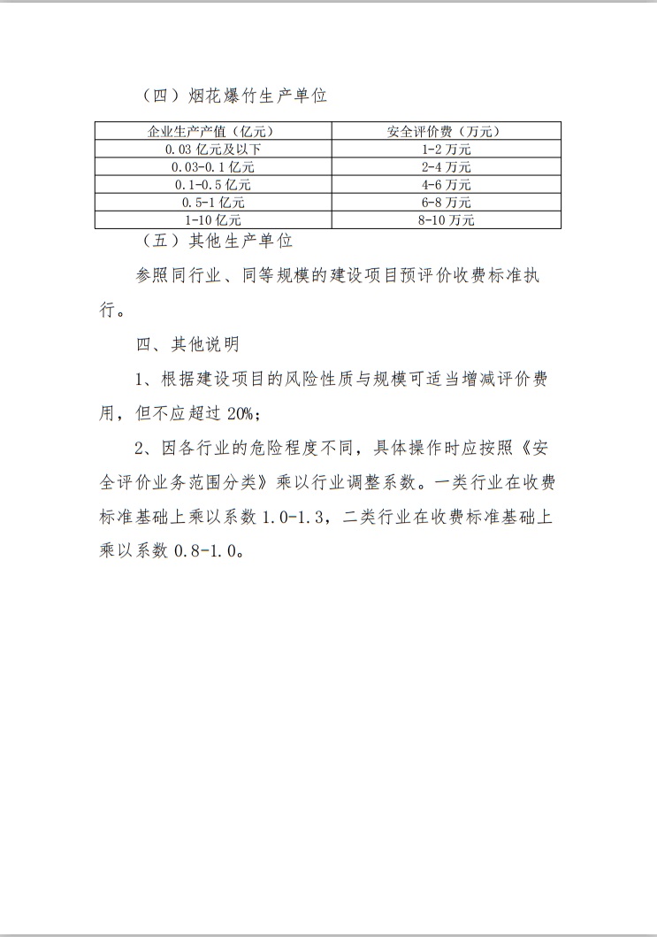 2、因各行業(yè)的危險(xiǎn)程度不同,具體操作時(shí)應(yīng)按照《安全評(píng)價(jià)業(yè)務(wù)范圍分類》乘以行業(yè)調(diào)整系數(shù)。一類行業(yè)在收費(fèi)標(biāo)準(zhǔn)基礎(chǔ)上乘以系數(shù)1.0-1.3,二類行業(yè)在收費(fèi)標(biāo)準(zhǔn)基礎(chǔ)上乘以系數(shù)0.8-1.0。