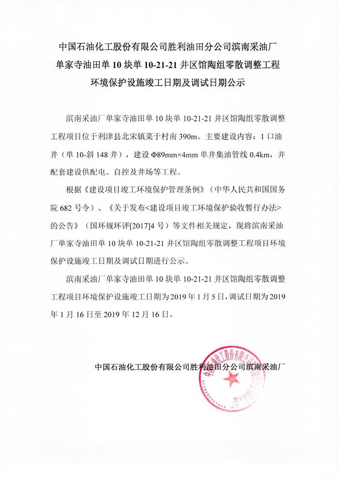 中國石油化工股份有限公司勝利油田分公司濱南采油廠單家寺油田單10塊單10-21-21井區(qū)館陶組零散調(diào)整工程環(huán)境保護(hù)設(shè)施竣工日期及調(diào)試日期公示